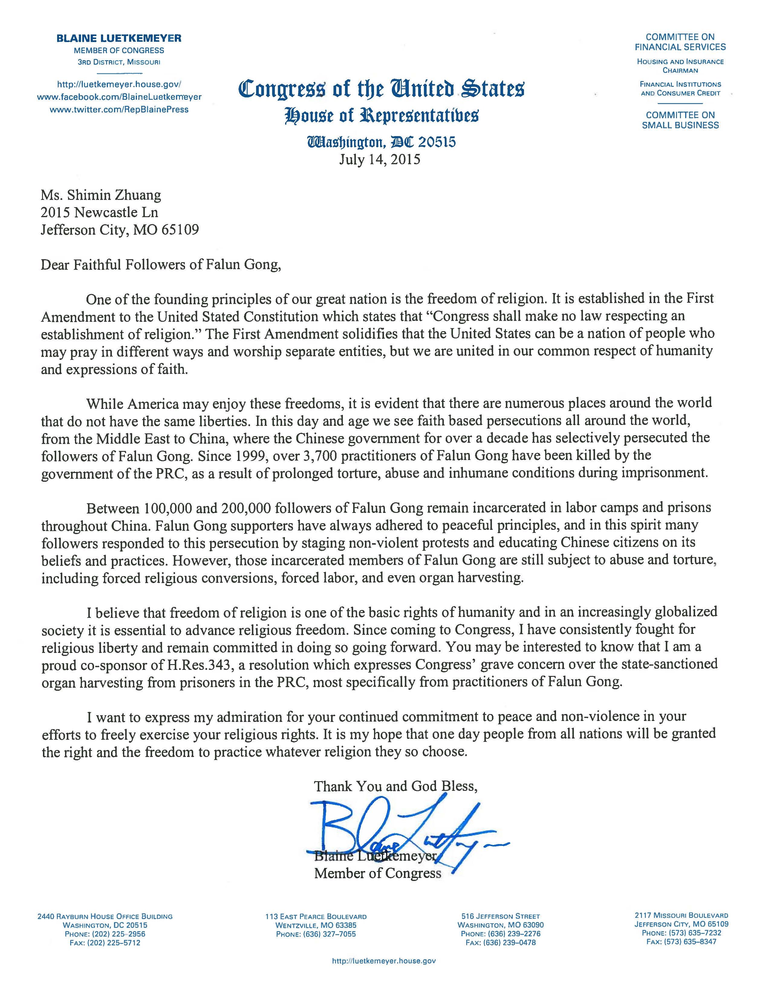 美国国会议员颁褒奖致信声援图为Blaine Luetkemeyer 表彰信函