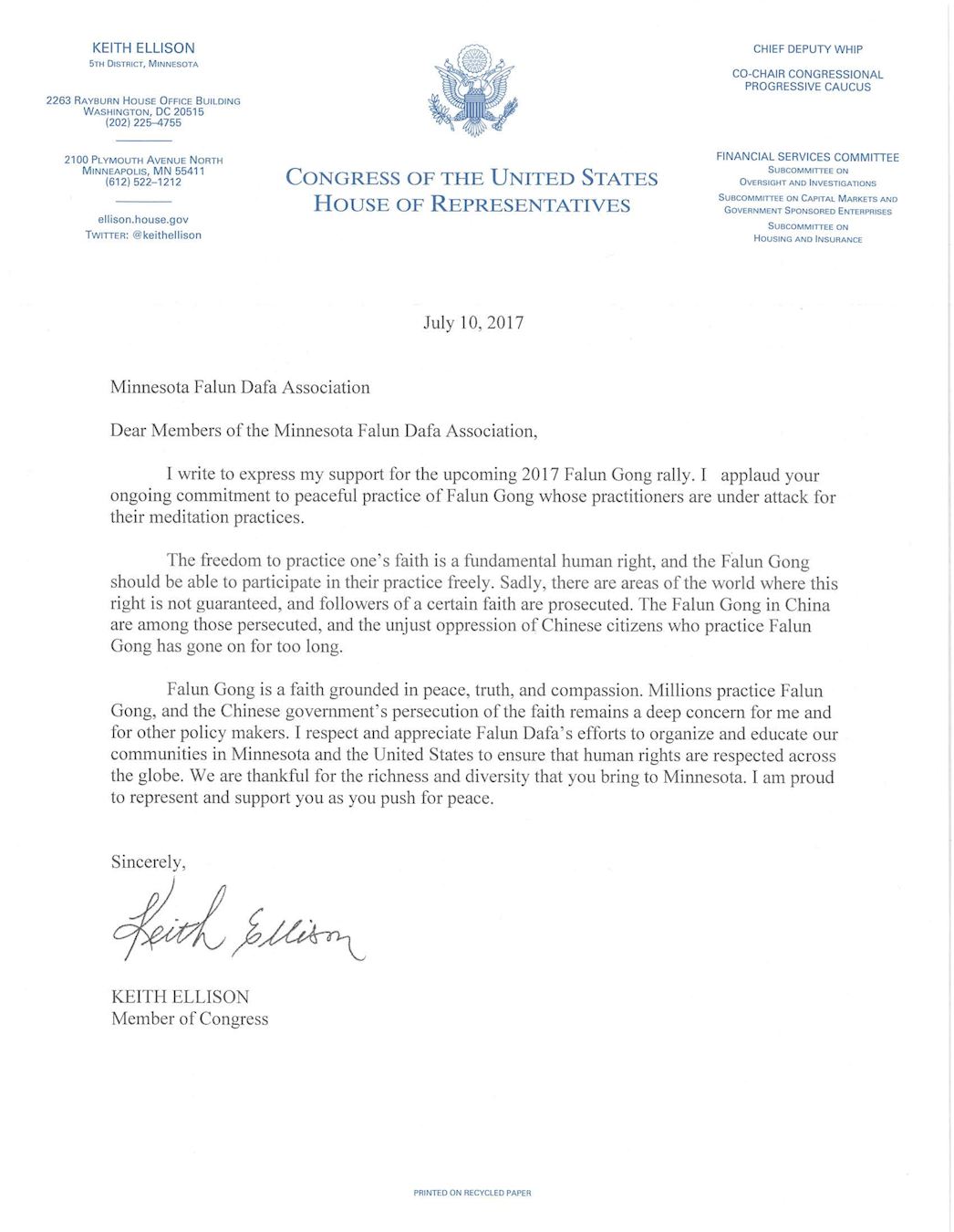 美国国会议员颁褒奖致信声援图为 Keith Ellison表彰的信函