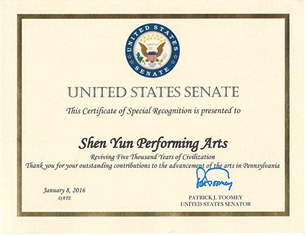 美国国会议员颁褒奖致信声援图为 Patrick J. Toomey的表彰证书