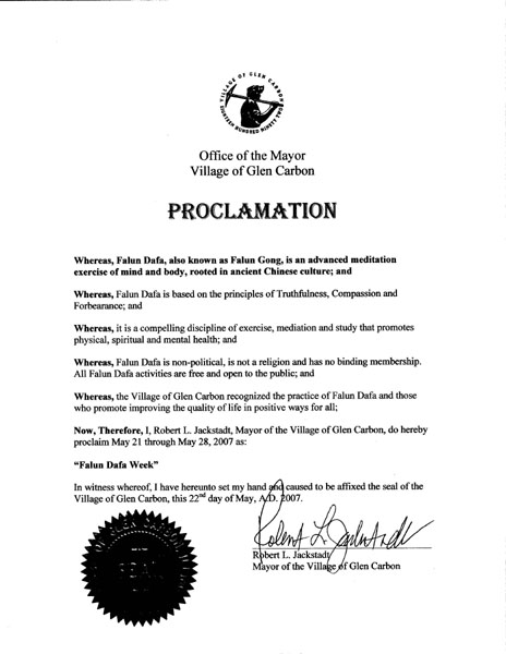 美国伊利诺伊州格林卡班市宣布法轮大法周图为褒奖证书