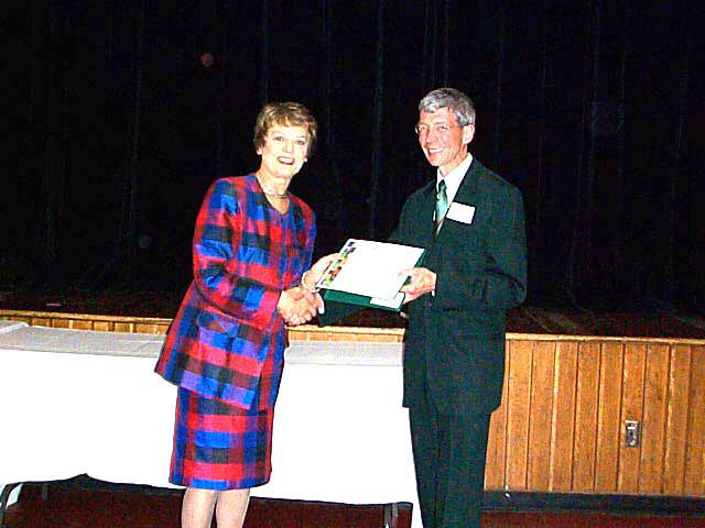 法轮功学员参加密苏里州奥法隆市的独立日游行,市长(左)为法轮功学员颁奖