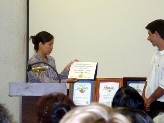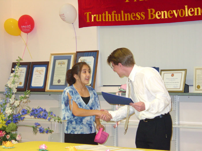加州洛杉矶县“法轮大法周”收到40个褒奖状,图为阿娜达.弗里曼女士代表国会议员西尔达.索丽丝颁发褒奖状