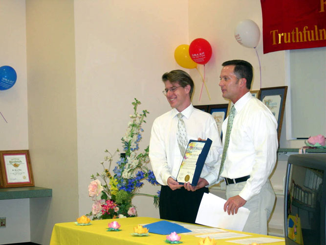佛州圣彼德堡市市议会褒奖李洪志老师和法轮功--图为詹姆斯.伯纳特先生与会议主持人合影