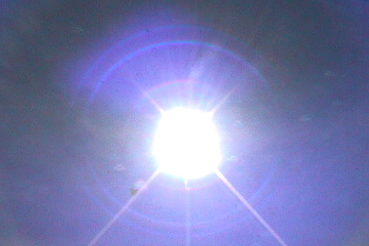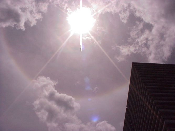 旧金山上空再现彩环围绕太阳, 彩环内外还有大小,颜色不同的旋转的小光环 2001-06-17