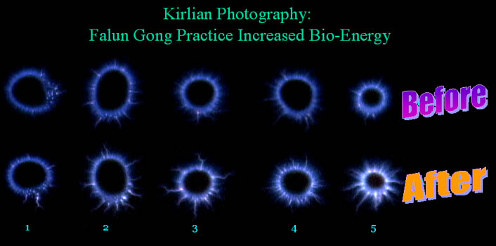 法轮大法在国际心理学年会上引起强烈反响图为在炼功前(上列)和炼功后(下列)的生物能量显像