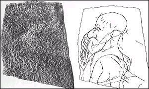 在秘鲁发现的ICA石雕: 一个惊慌的人被一只暴龙追着跑