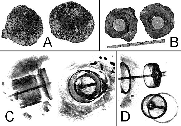 莫斯科郊区发现一块“天外来的石头”, 从图片可见石头内有类似绕线轴和螺栓的物体