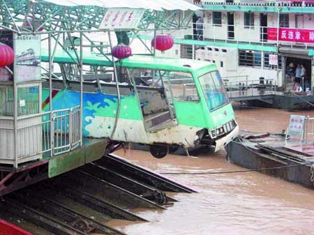 特大暴雨突袭重庆全境 --半悬于长江上的脱轨缆车 2002-06-13