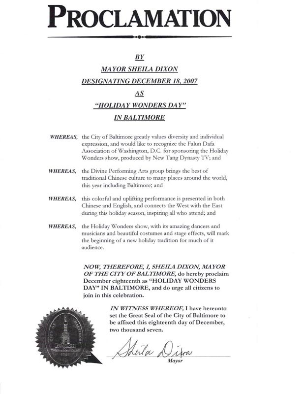 巴尔的摩市长Sheila Dixon签发褒奖令贺神韵
