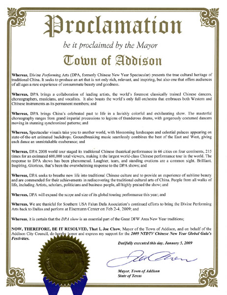 达拉斯地区艾迪森市市长周建源签署嘉奖令