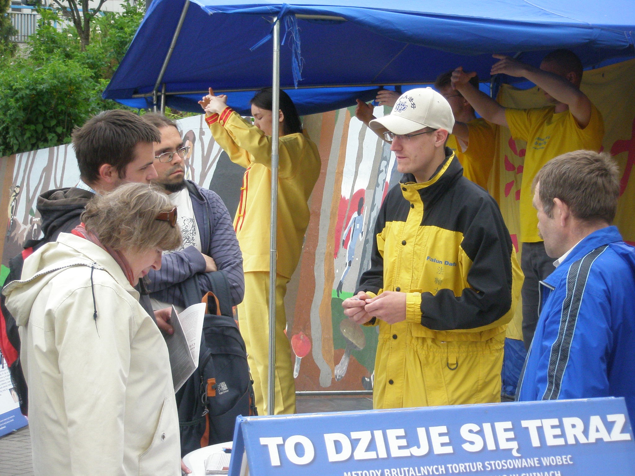 波兰法轮功学员在华沙市中心地铁站前广场举行活动,恭祝师尊李洪志先生六十华诞并同庆同贺世界法轮大法日