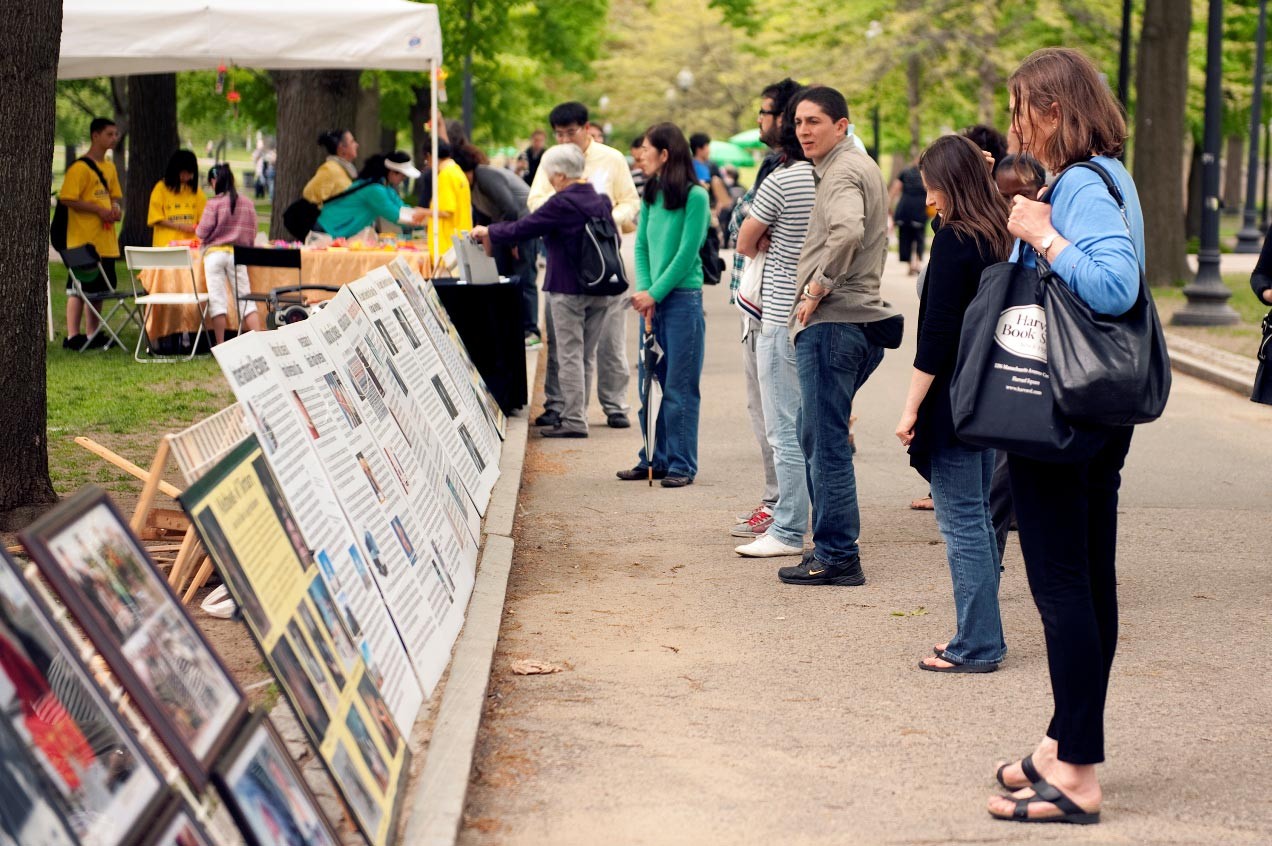 游人停下脚步观看展板,上面展示的是揭露中共以酷刑迫害法轮功学员的图片