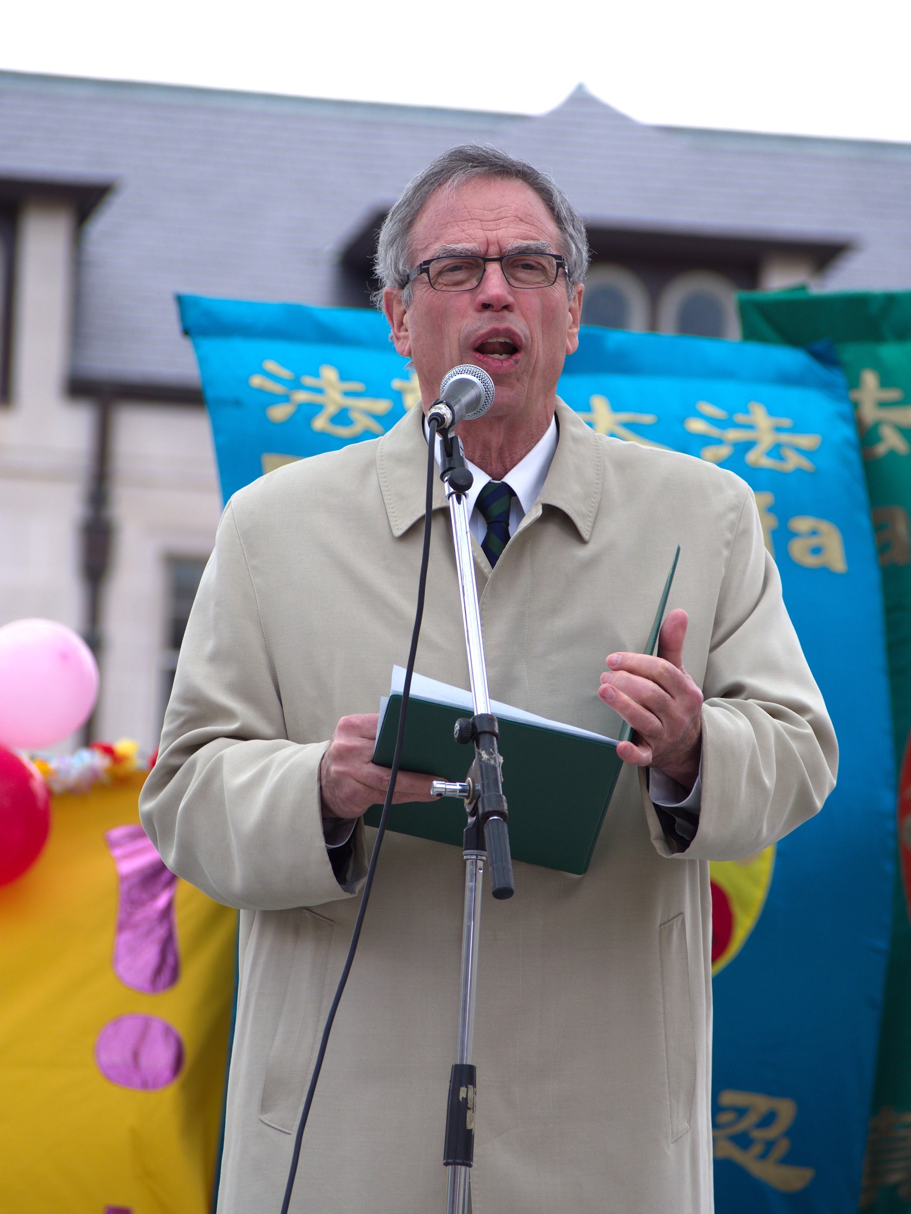 法轮功学员及民众庆祝法轮大法日,政要现场支持图为市议员John Parker