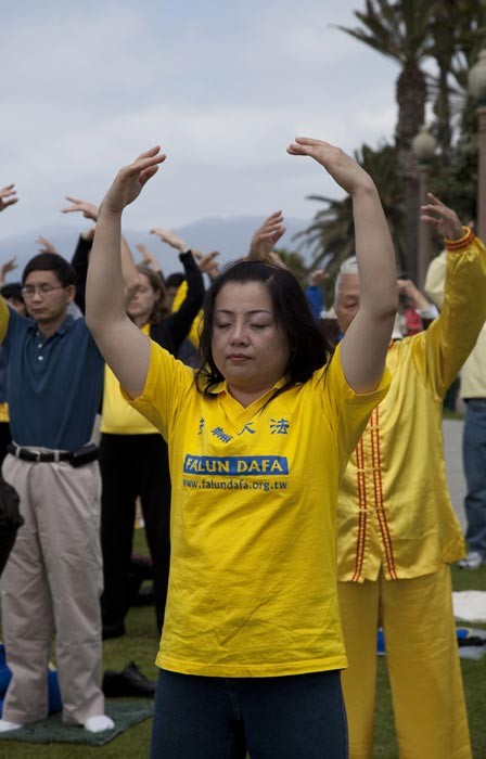法轮功学员在洛杉矶举行欢庆世界法轮大法日活动,集体炼功