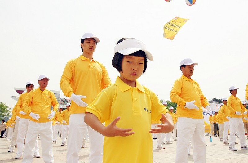 法轮功学员在高雄庆贺世界法轮大法日,举办活动,集体炼功.