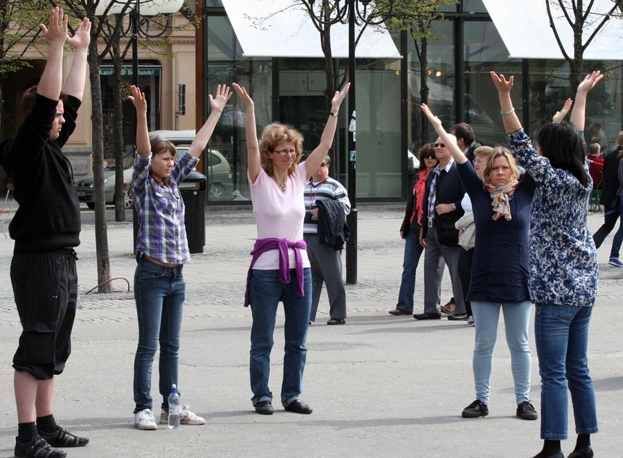 瑞典法轮功学员集体炼功,讲真相,庆祝世界法轮大法日