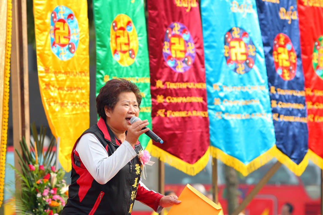 法轮功学员在中坜庆祝法轮大法日,举办活动,谢师父救度洪恩,立法院顾问邱垂贞发言
