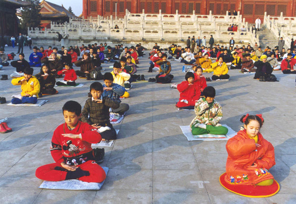 北京劳动人民文化宫的法轮功小学员炼功点,图为小学员集体炼功 中国 北京