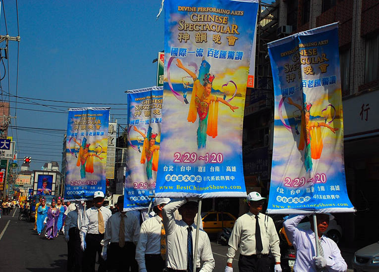 台湾嘉义踩街广传神韵艺术团演出图为游行中神韵晚会大型旗帜迎风招展2008-3-9