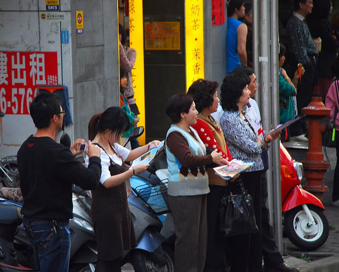 台湾嘉义踩街广传神韵艺术团演出图为工作人员为商家说明演出内涵2008-3-9