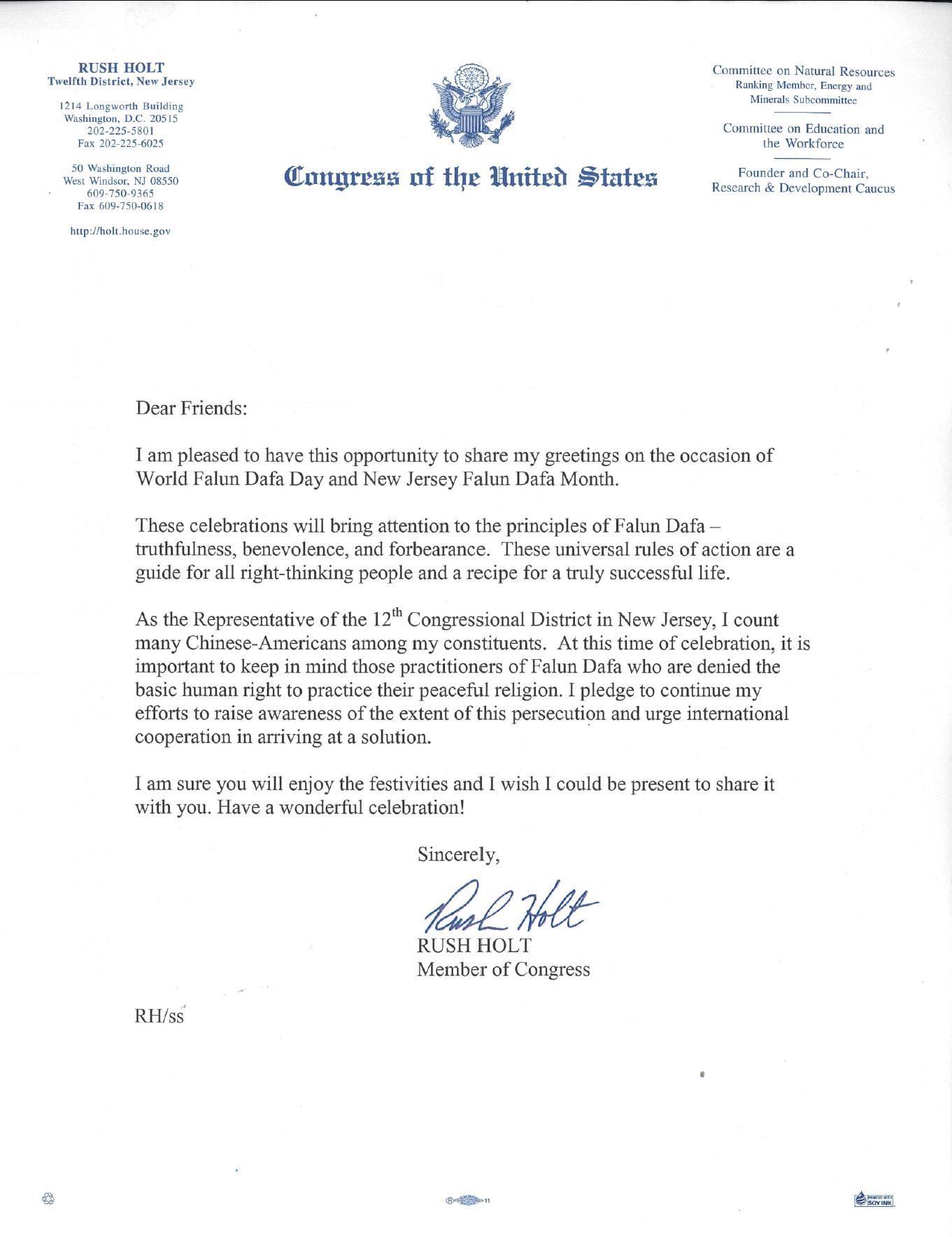 美国新泽西州国会议员浩特祝贺法轮大法日