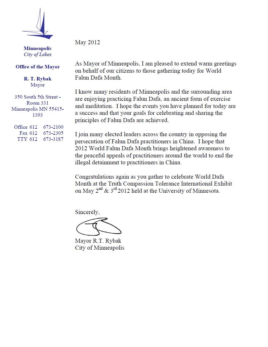 美国明尼阿波利斯市市长祝贺法轮大法月