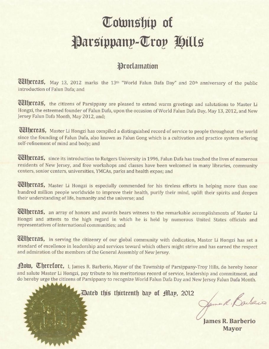 美国新泽西州十城市颁褒奖庆贺法轮大法日,莫里斯市市长