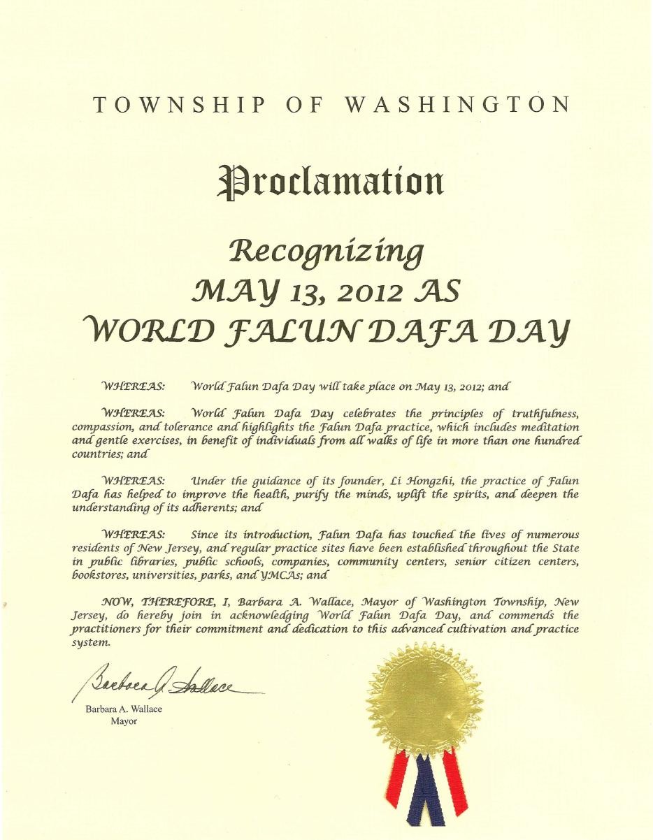 美国新泽西州十城市颁褒奖庆贺法轮大法日,华盛顿市市长