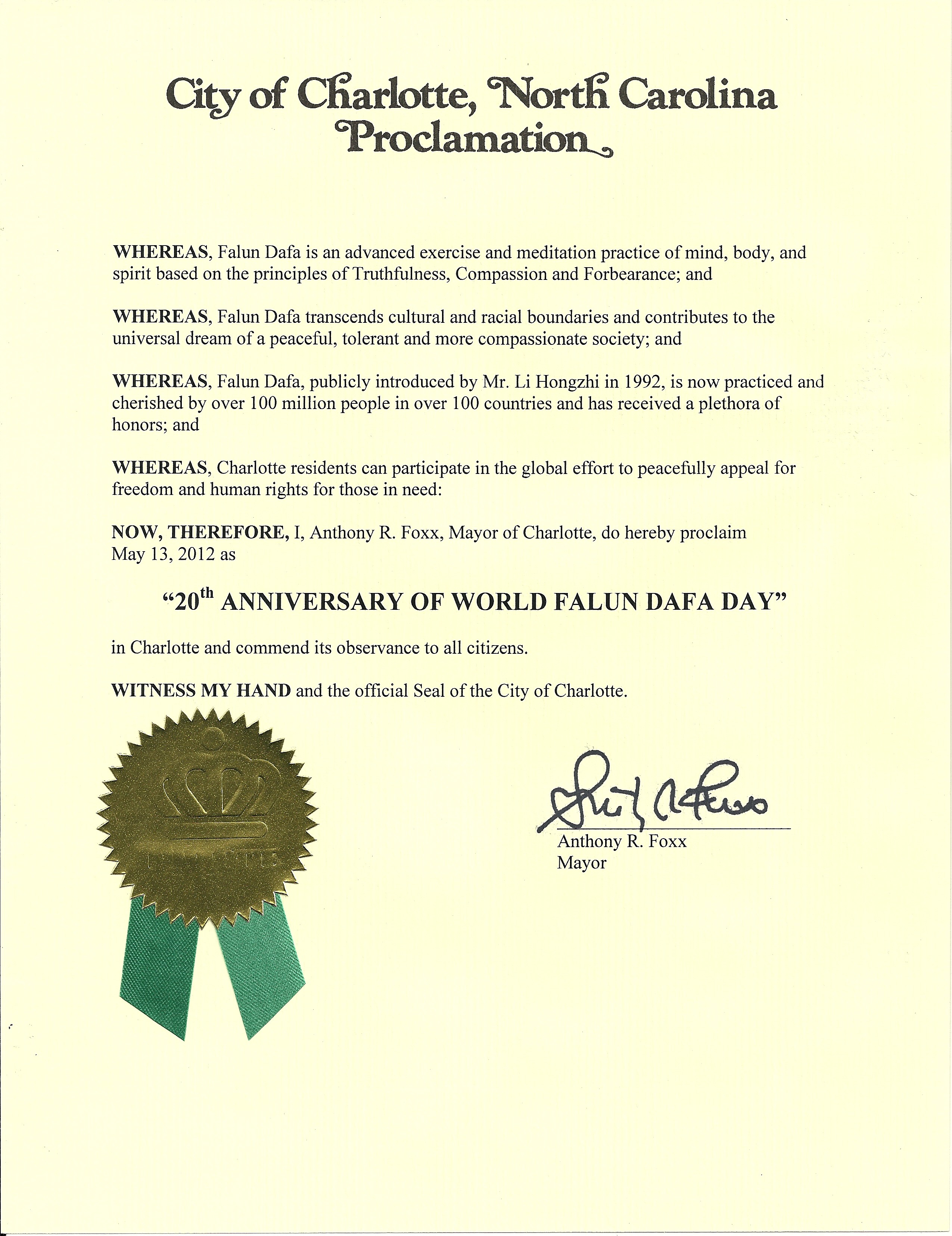美国北卡莱罗纳州夏洛特市宣布世界法轮大法日