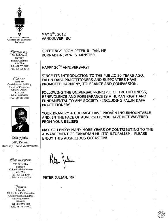本拿比—新西敏选区的国会议员Peter Julian的贺信