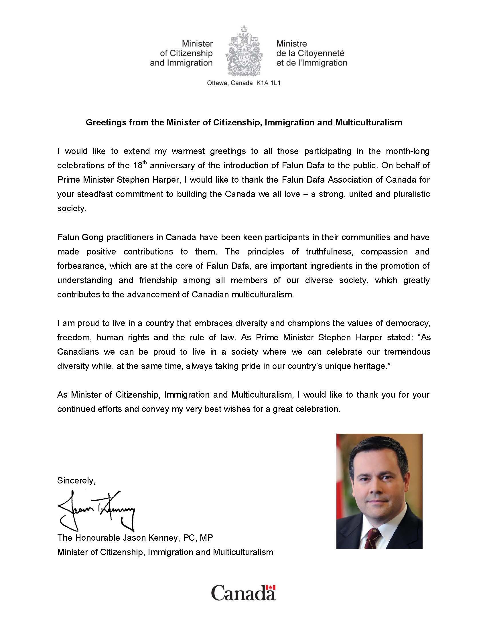 加拿大政要祝贺法轮大法月,图为多元文化部长肯尼的贺信