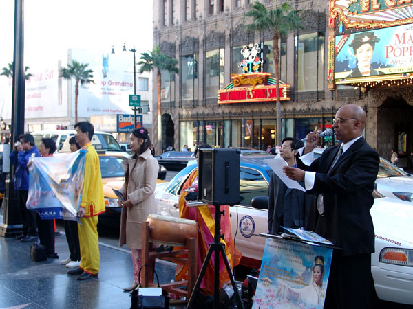 新唐人新年晚会感动好莱坞 图为脱口秀主持人杰弗瑞• 韩德森 (右,Jeffrey Henderson) 在演出前两天就来到柯达剧院门前为新唐人晚会宣传 2007-1
