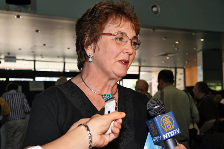 新唐人新年晚会在德国柏林完美卓绝的演出图为弗朗索瓦兹•兰佩蒂女士接受观后的采访