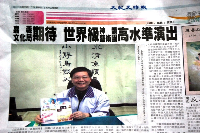 神韵艺术团在高雄演出图为建设局观光科科长麦东宝表示让人的心灵宁静,得到升华