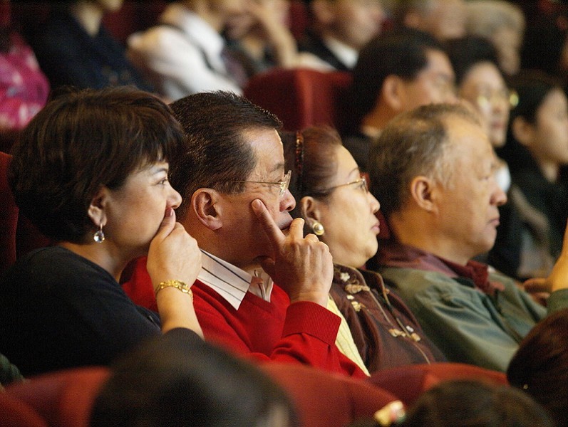 三永陶瓷企业董事长翁丽秋专注地观看神韵演出她发现神韵演员的动作表情令人着迷