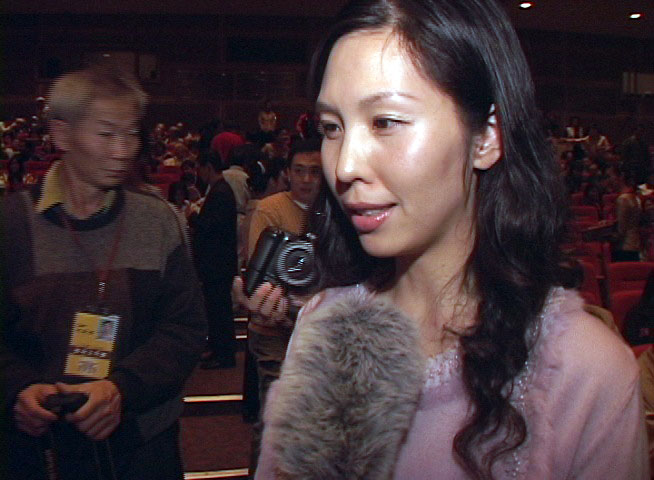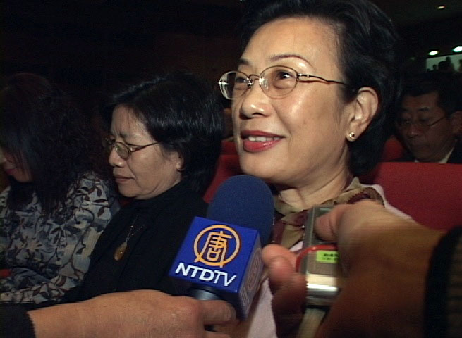 神韵纽约艺术团在高雄演出图为郑如意妇女咨询执行长表示演员用肢体语言感动人2008-3-5