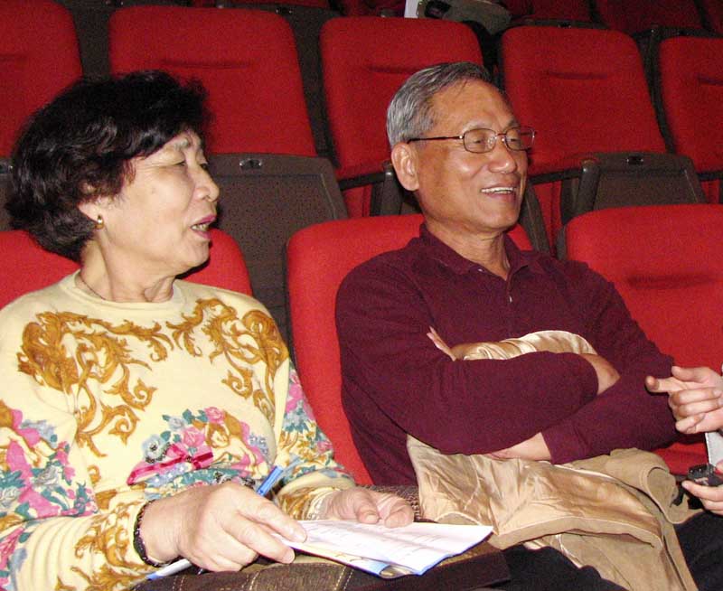 交响乐团长蔡淑媛(右)与总监卢逸祥(左)观赏神韵在高雄演出表示耳目一新,深具启发性2008-3-6