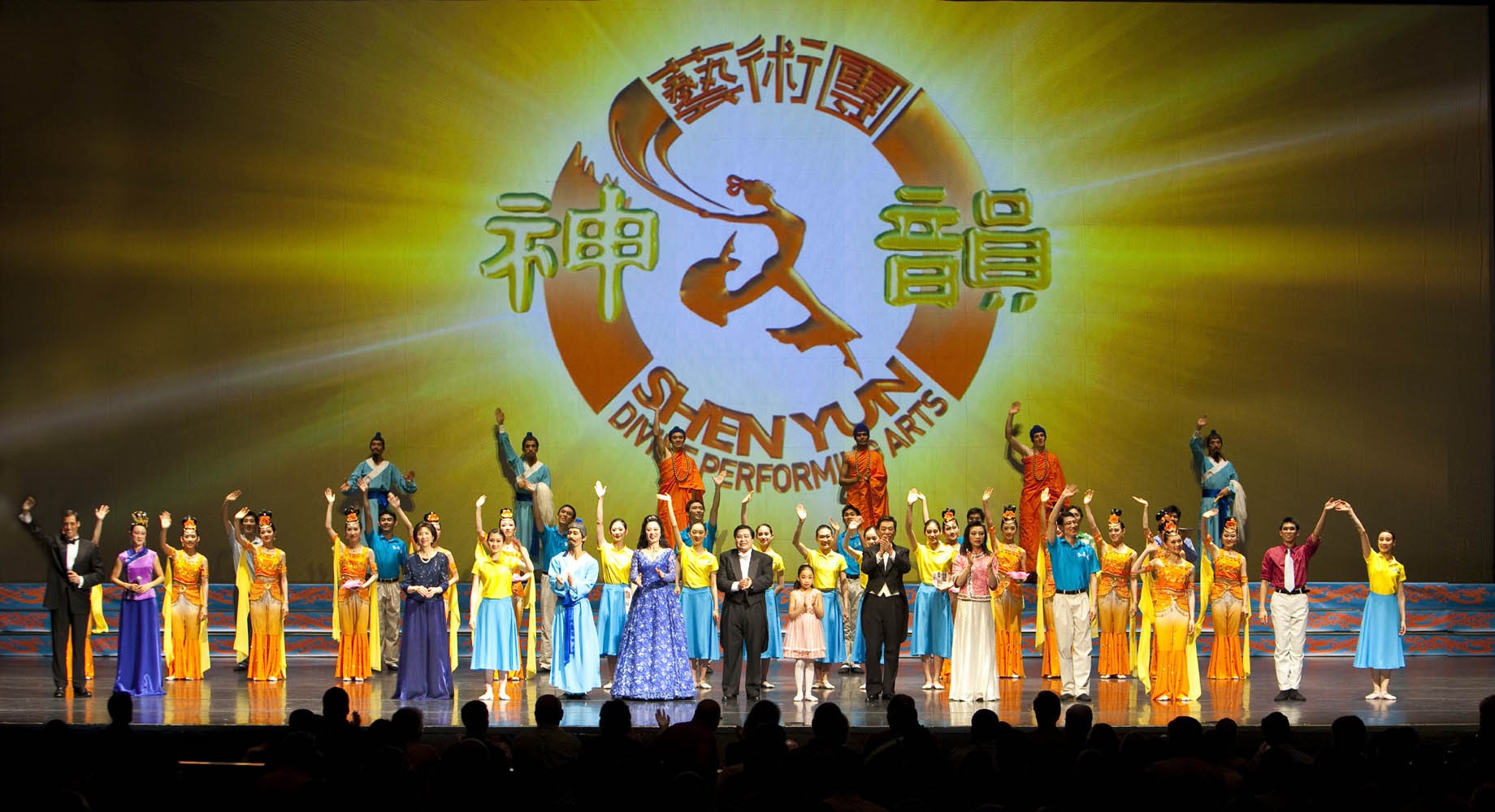 神韵晚会演出结束,现场两千余名观众起立、挥手,向神韵艺术团致敬。