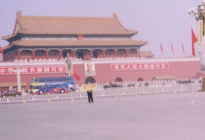 2002年2月学员在天安门广场举着“法轮大法好”的横幅和平请愿 遭警察拘捕