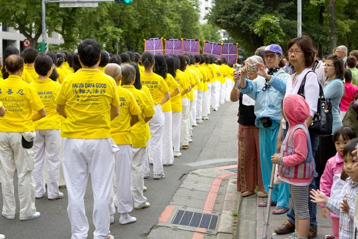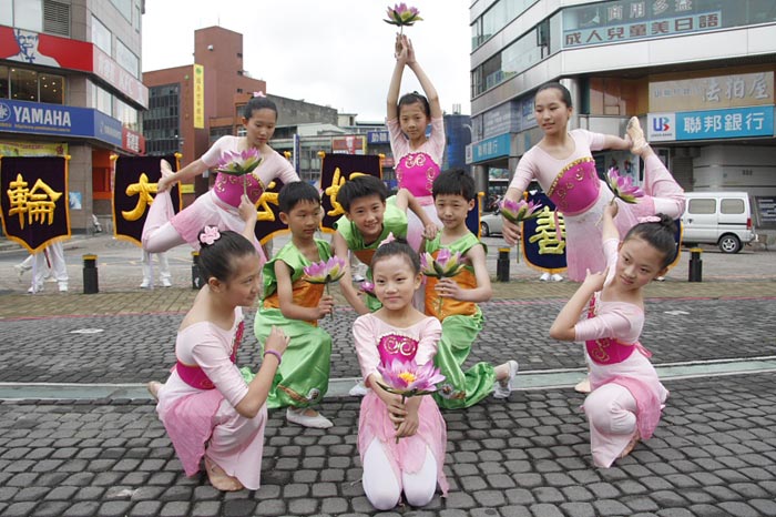 台湾北区学员在台北市中心信义广场举行庆祝活动,歌颂大法洪恩,图为 2008-5-11