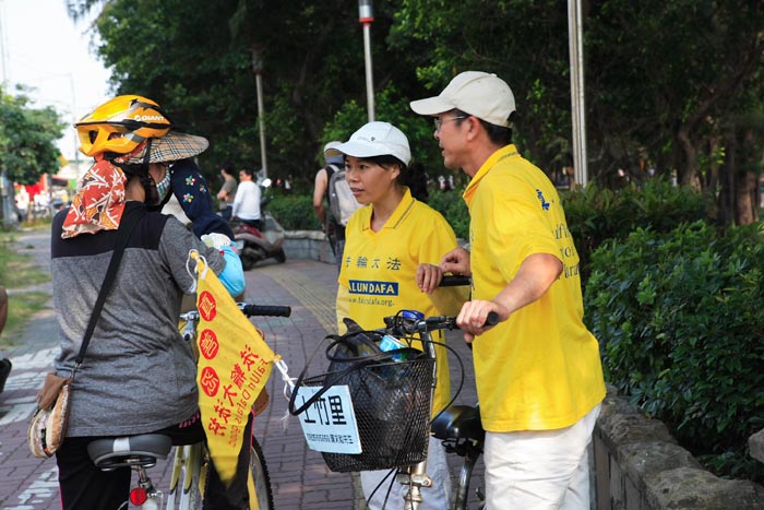 台湾学员在桃园县政府前的县民广场庆祝世界法轮大法日,图为邱先生对真相资料提建议 2008-5