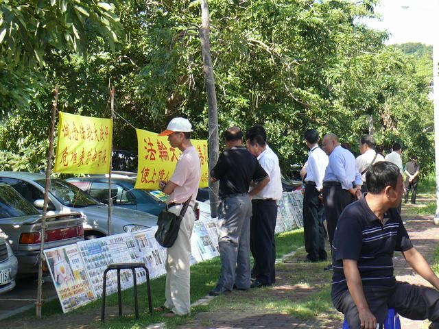 法轮功学员在台东庆祝世界法轮大法日,感谢师恩,真相展版吸引许多大陆游客
