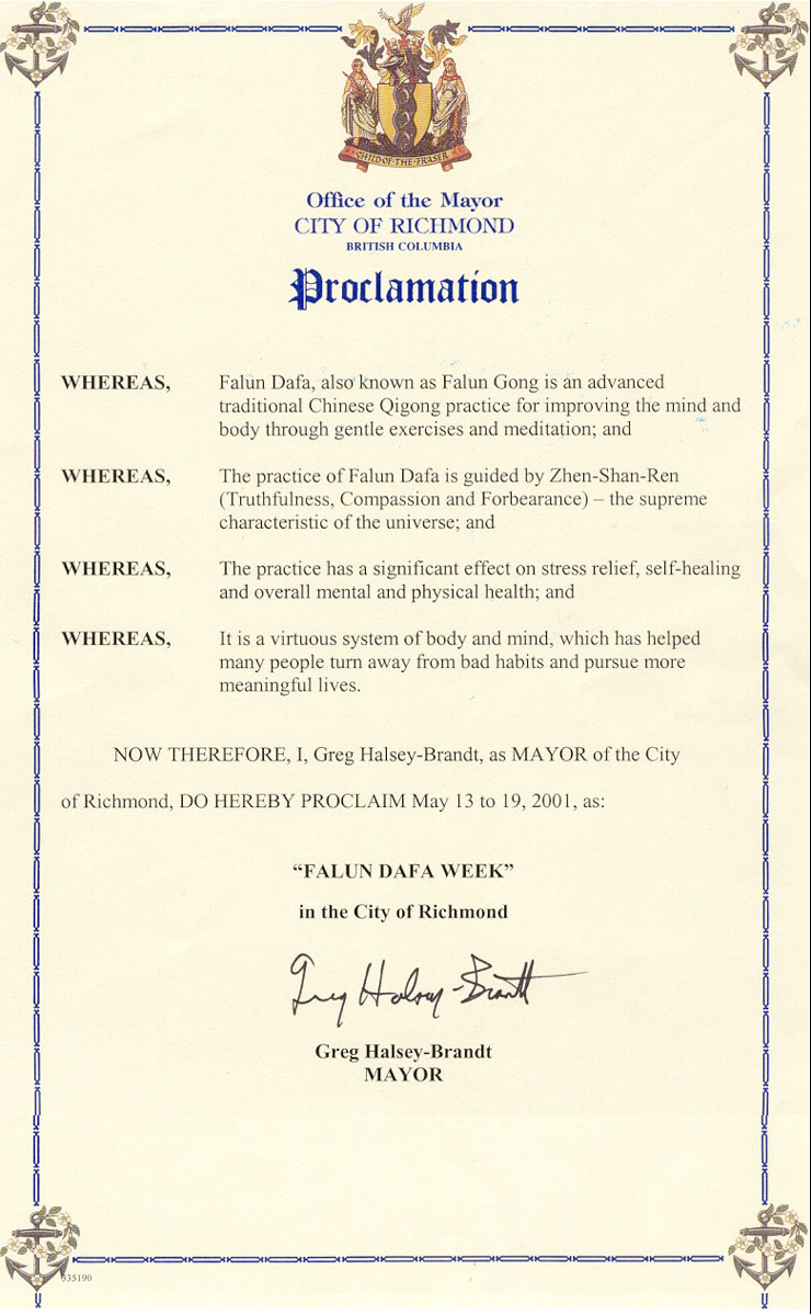 加拿大不列颠哥伦比亚省列治文市宣布“法轮大法周”