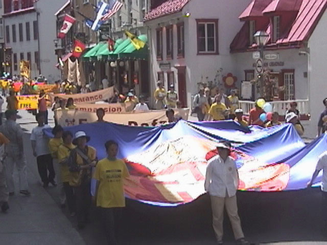 为加拿大法轮大法节庆祝活动的一部分,5月21日魁北克省府魁北克城举行的集体炼功和游行洪法活动