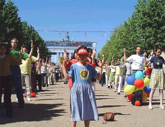 德国学员在柏林市中心的马勒讷-蒂特利西广场进行全天活动庆祝世界法轮大法日--布兰登堡门前集体炼功