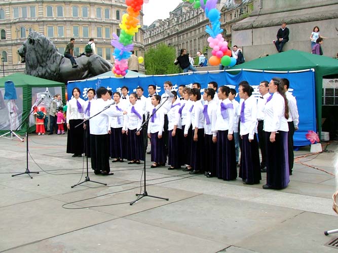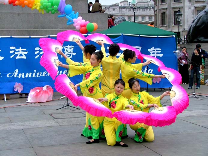 英国学员鸽子广场庆祝法轮大法洪传十二周年