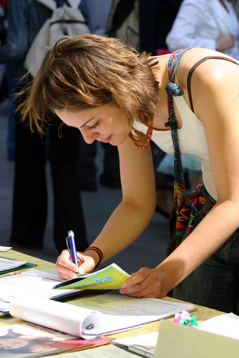 芬兰学员在赫尔辛基市中心举行活动,庆祝法轮大法洪传世界十六周年,图为路人了解真相 2008-5-10