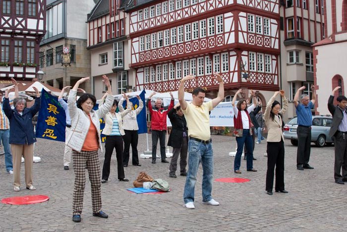 法轮功学员在法兰克福欢庆大法日广传真相图为集体炼功