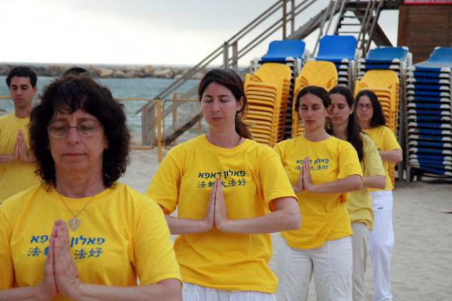 以色列法轮功学员在世界大法日举办活动图为在海边集体炼功2007-5-13