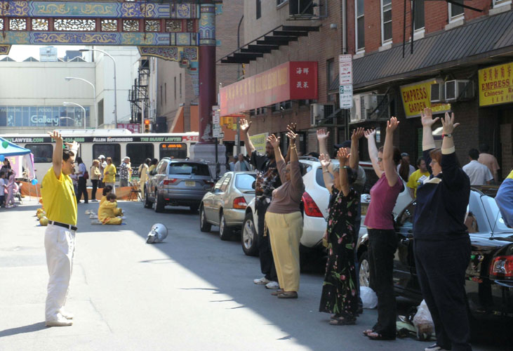 法轮功学员在大费城庆祝“世界法轮大法日”图为学员在华埠“友好城门”前集体炼功2007-5-13